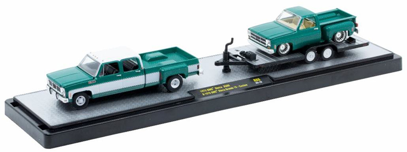 1973 GMC Sierra 3500 and 1976 GMC Sierra Grande 15 Custom Built with Flat-Bed Hauling Trailer - A detailed two-tone GMC hauler with trailer, loaded with authenticity and diecast detail - Auto-Haulers Release