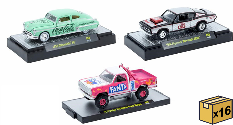 Sixteen 3-Piece Sets. Each car comes in an acrylic case with pegable packaging.