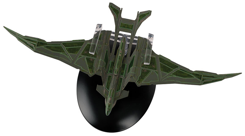 By the end of the 24th century, the Romulan Free State had updated its warbird designs to this new model – a finned, segmented attack vessel armed with powerful disruptors, its belly decorated with a painted bird-of-prey. Though these ships saw use more openly throughout the Romulan Free State, more sinister actors also put them to work. When the secretive Zhat Vash triggered an assault on the synthetic planet of Coppelius, over 200 of the new Romulan Warbirds joined their genocidal fleet.