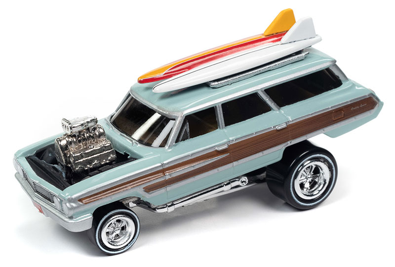 1964 Ford Country Squire in Light Blue and Wood Paneling with Surfboards