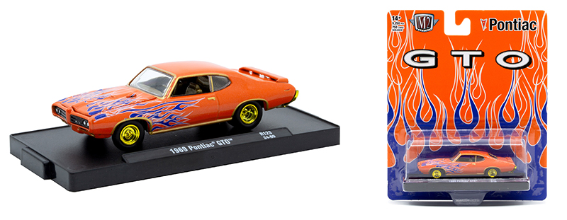 1969 Pontiac GTO in Orange with Blue Flame Decals with Chrome Gold Rims