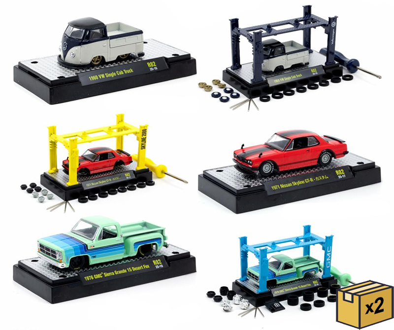 Two 3-Piece, high-detail sets. Each car comes in an acrylic case with peggable packaging.