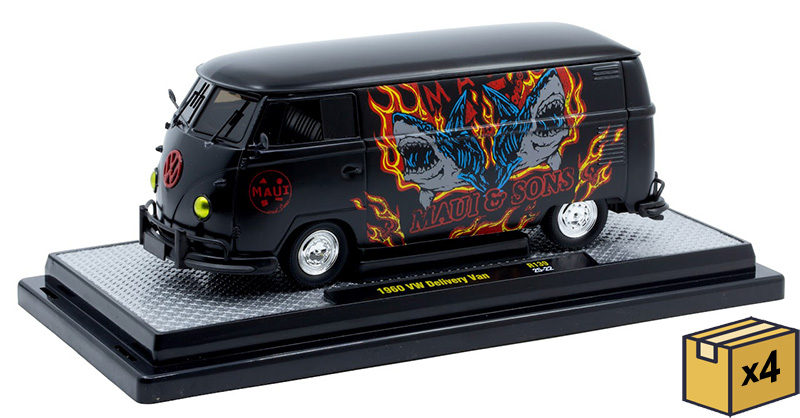 1960 Volkswagen Delivery Van in Black with Maui and Sons Flaming Dual-Shark Graphics in a Non-Returnable 4-Piece CASE