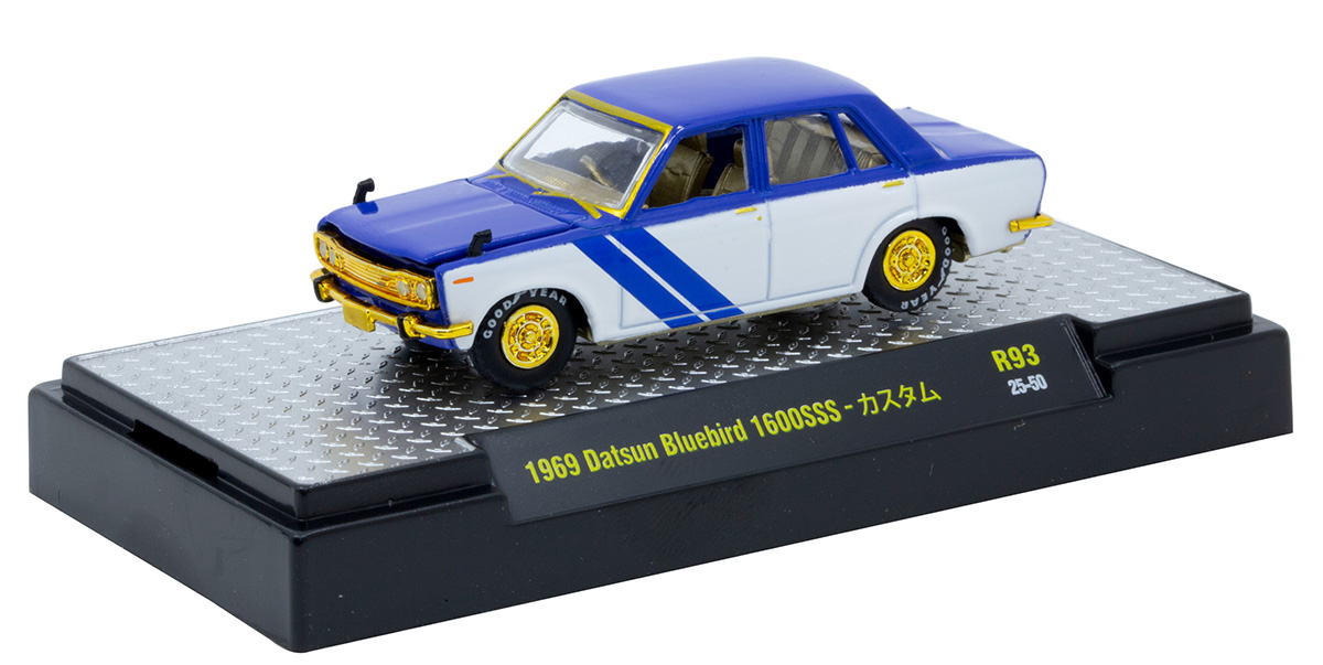 1969 Datsun Bluebird 1600SSS in Blue and White with Gold Chrome Rims and Accents