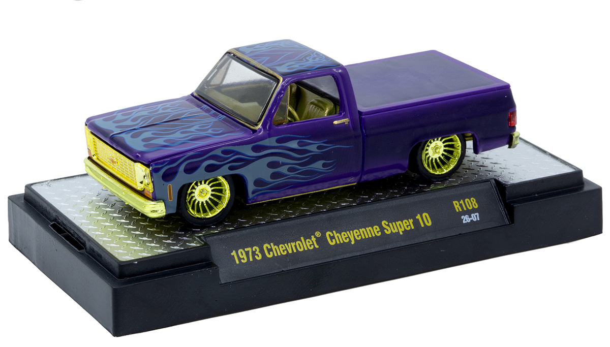 1973 Chevrolet Cheyenne Super 10 in Purple with Blue Flames and Gold Chrome Rims, Interior and Accents