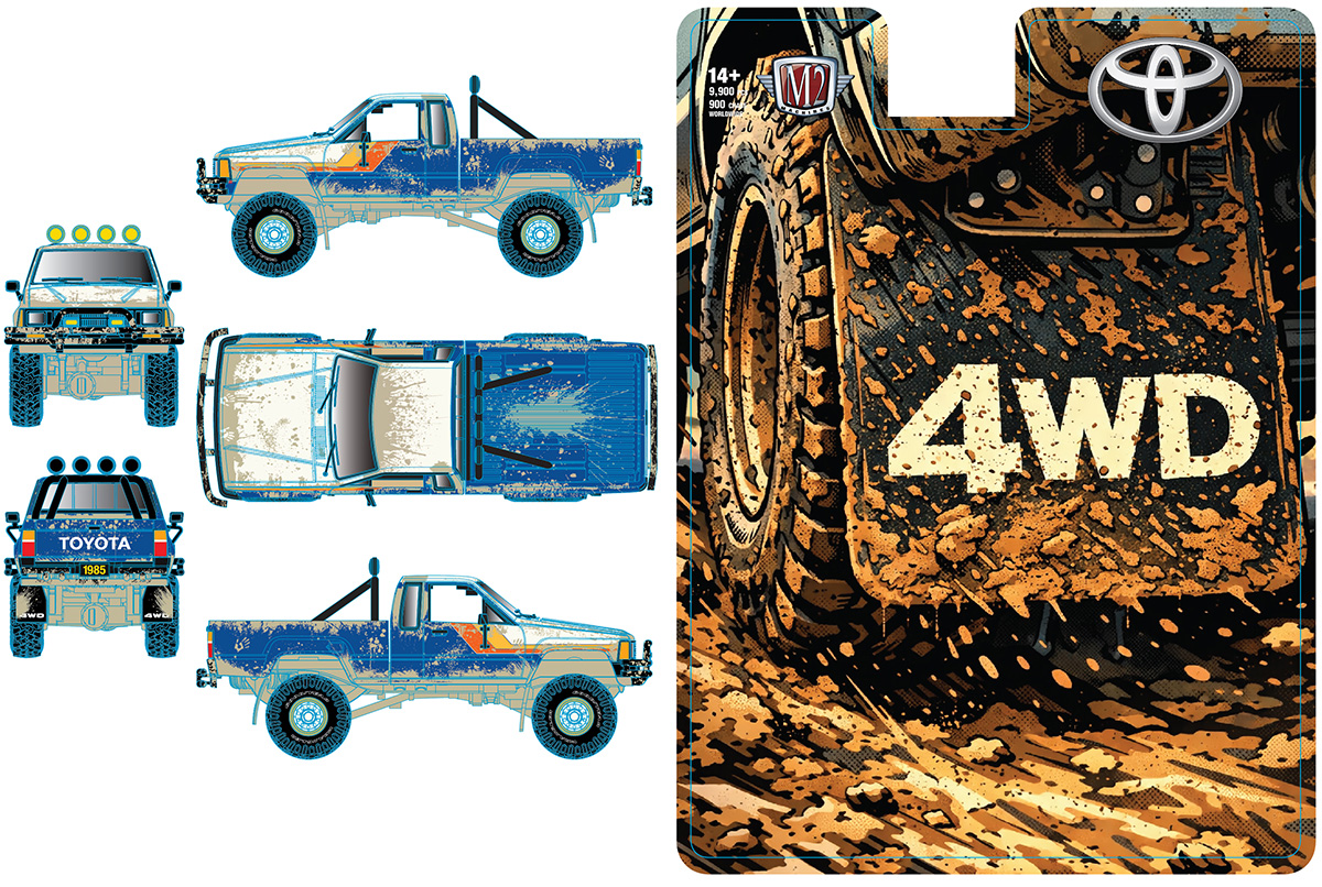 1985 Toyota Truck 4X4 in Blue and White with Orange and Red Stripes and Mud Splatter Graphics