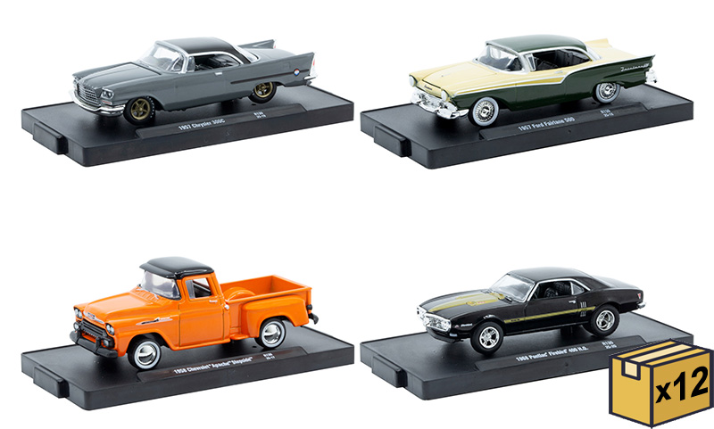 Twelve 4-Piece Sets. Each car is separately packaged in blister card packaging. Look for M2Machines' rare Chase Cars inserted into cases at random.