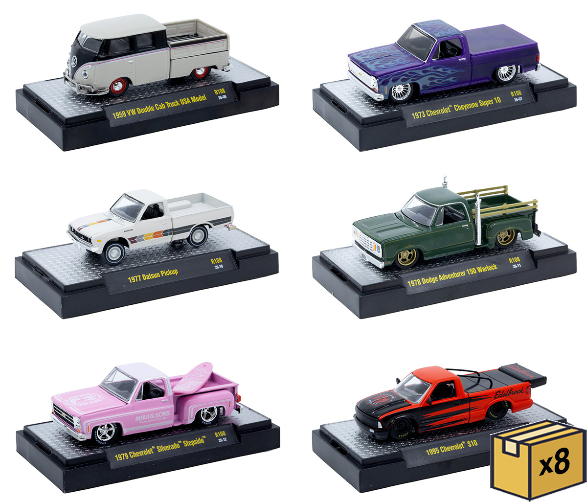 Eight 6-Piece Sets. Each model features a fresh design and comes packaged in a themed box that enhances the diecast model inside. Look for M2Machines' rare Chase Cars inserted into cases at random.
