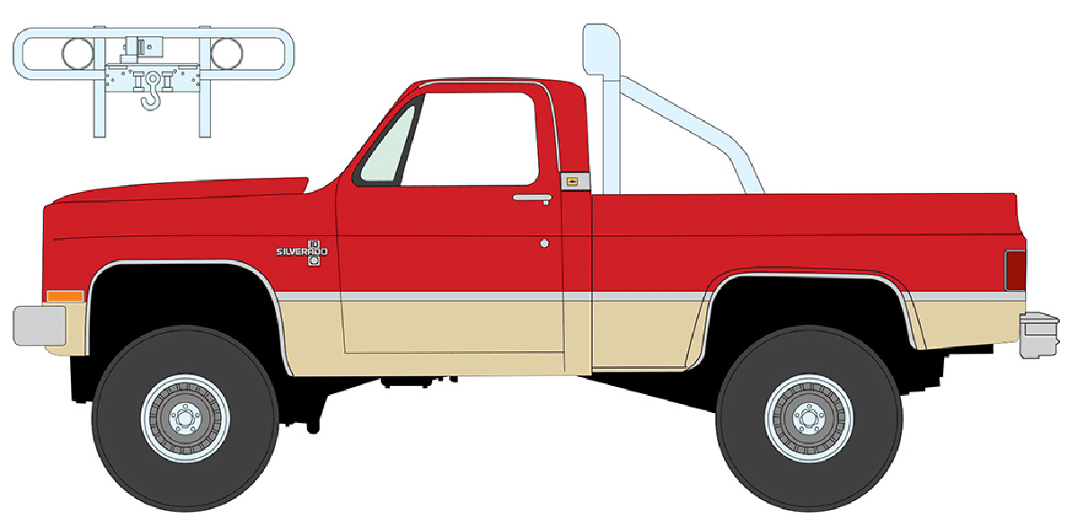 • 1987 Chevrolet Silverado Fleetside 4x4 Pickup Truck with Roll Bar and Push Bar in Bright Red with Tan Lower 2-Tone
