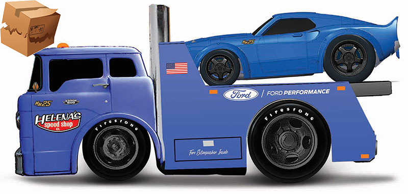 Helenas Special Shop - 1966 Ford C60 Flatbed in Blue with 1969 Ford Mustang GT in Blue
