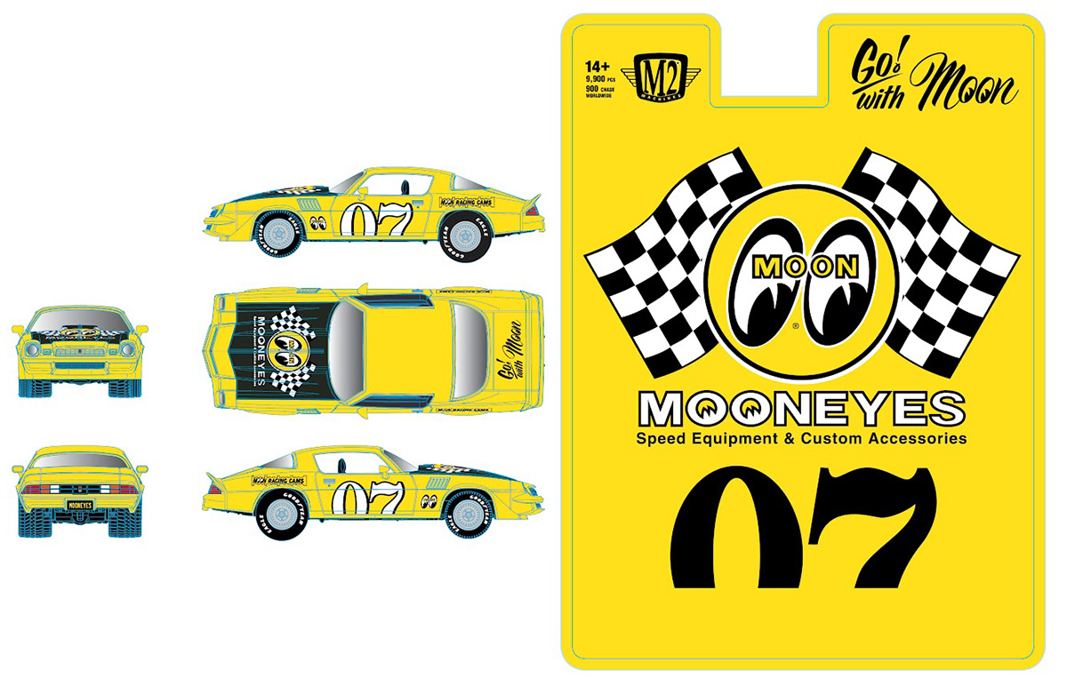 Mooneyes - 1979 Chevrolet Camaro Z/28 in Yellow with Black Hood and #07 Racing Graphics