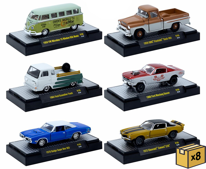 Eight 6-Piece Sets. Each model features a fresh design and comes packaged in a themed box that enhances the diecast model inside. Look for M2Machines' rare Chase Cars inserted into cases at random.