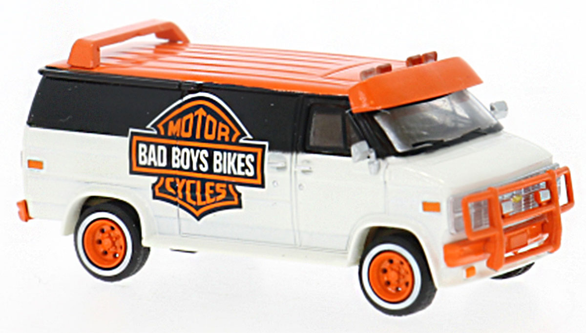 Bad Boy Bikes Motorcycles - 1983 Chevrolet C20 Van in White, Orange, and Black