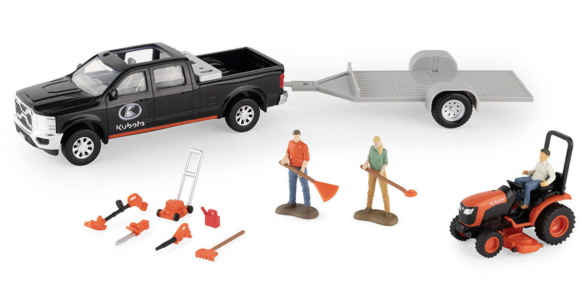 Kubota Lawn Care Playset with Pickup Truck, Trailer, Riding Mower, Two Figures, and Assorted Tools p>