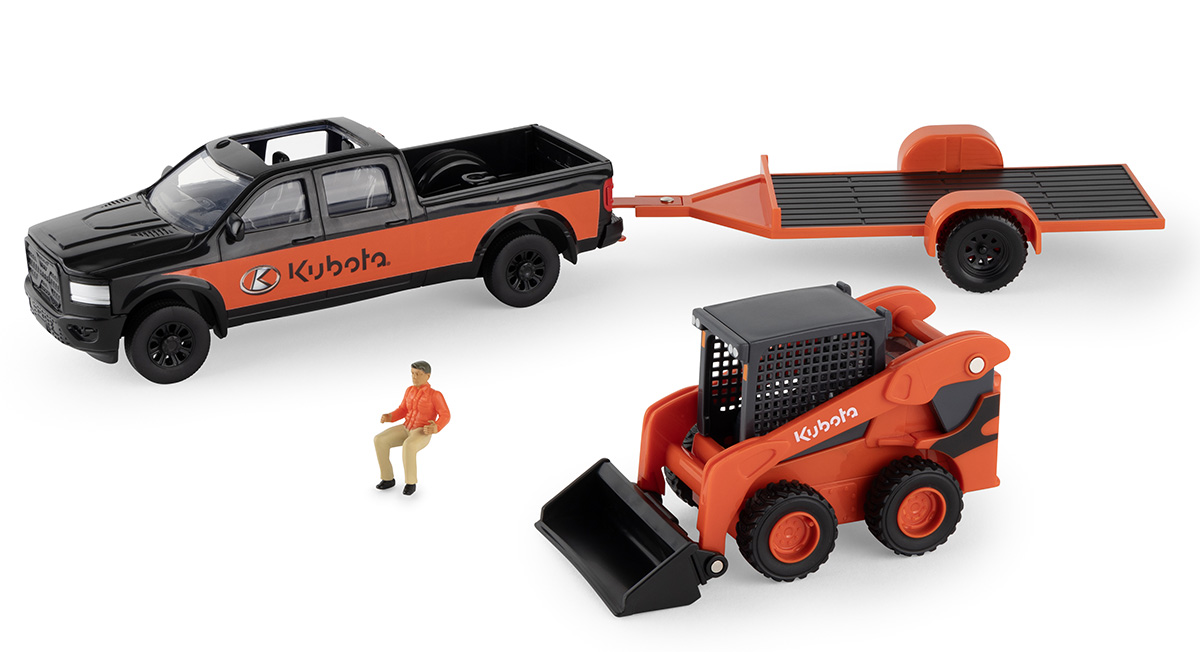 Kubota Skid Steer Loader and Truck Set with Trailer and Sitting Figure