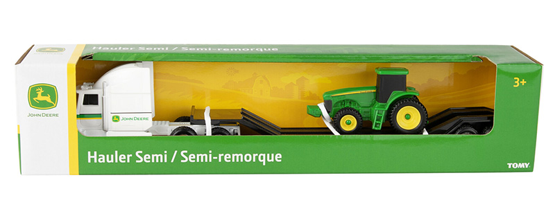 John Deere Farm Semi in White with Flatbed Trailer hauling a Four-wheel Drive Tractor