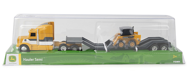 John Deere Farm Semi in Yellow with Flatbed Trailer hauling a Four-wheel Drive Tractor