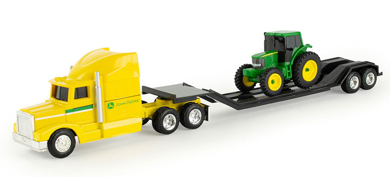 John Deere Farm Semi in Bright Yellow with Flatbed hauling Four-wheel Drive Tractor
