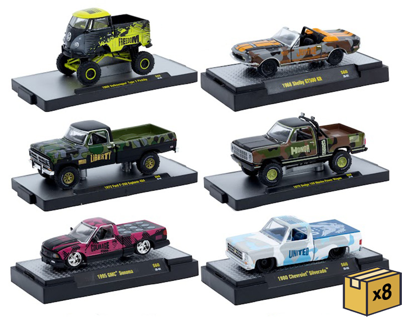 Eight 6-Piece Sets. Each car comes in an acrylic case with pegable packaging.