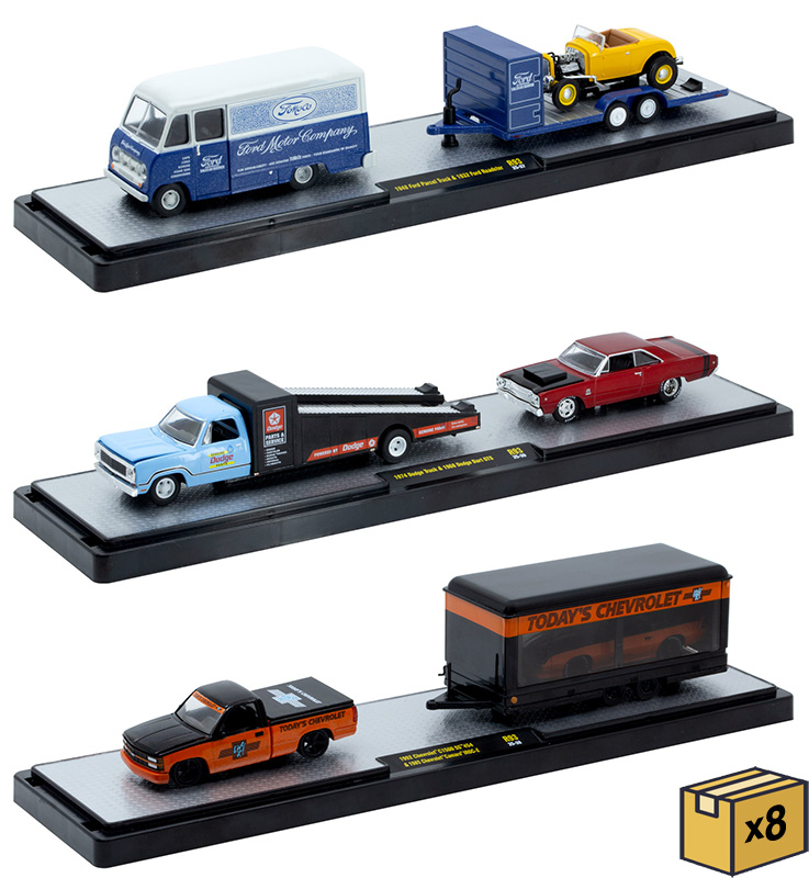 Eight 3-Piece Sets. Each car comes in an acrylic case with pegable packaging.