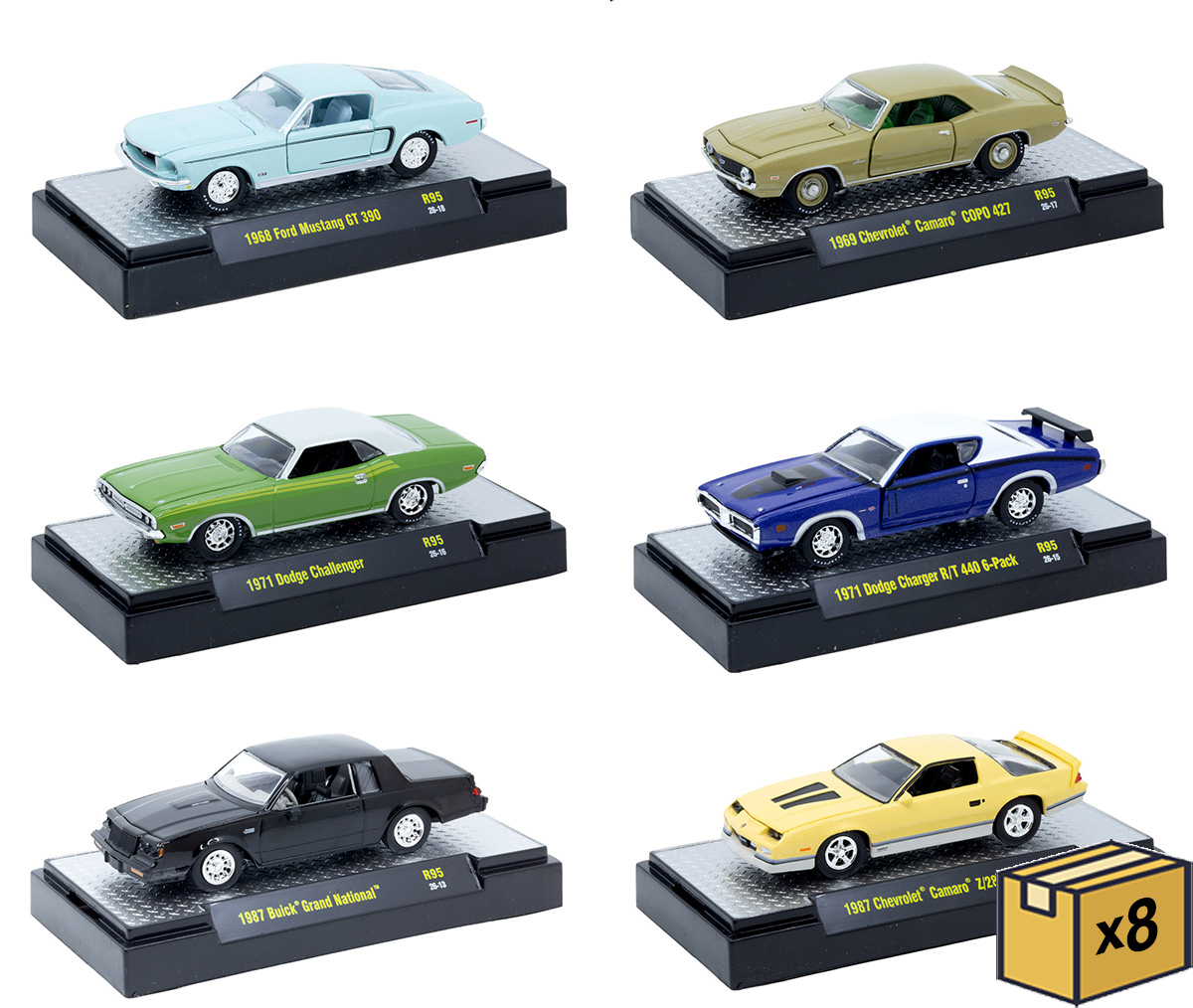 Eight 6-Piece Sets. Each car comes in an acrylic case with pegable packaging.