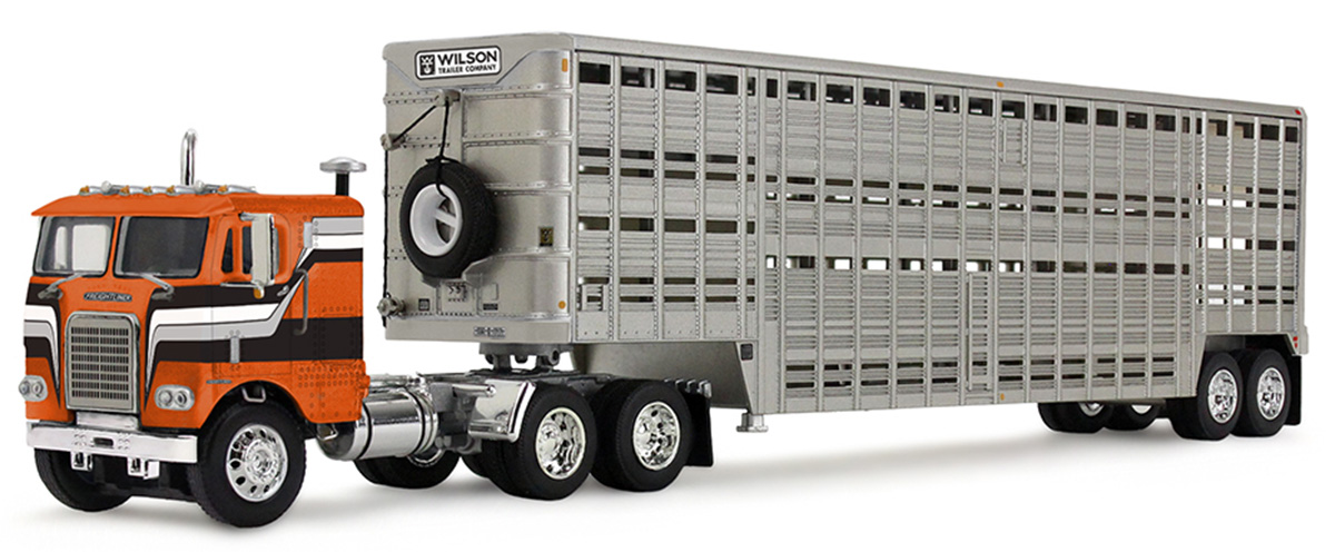 Freightliner COE in Orange and Black with 45 Wilson Vintage Livestock Trailer