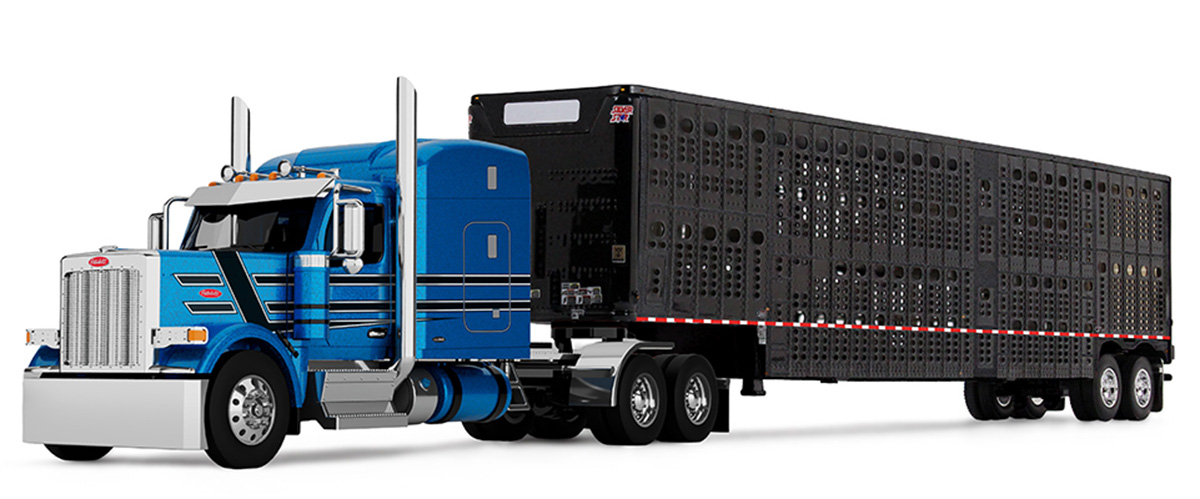 Peterbilt Model 589 with 72 Mid-Roof Sleeper with Wilson Silverstar Livestock Trailer in Bright Blue with Black Stripes