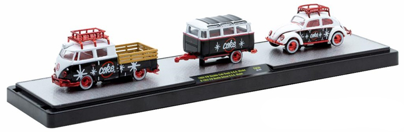 Coca-Cola - 1960 Volkswagen Double Cab Truck U.S.A. Model and 1963 Volkswagen Beetle Deluxe U.S.A. Mode in White and Black with Red Chrome Rims and Accents