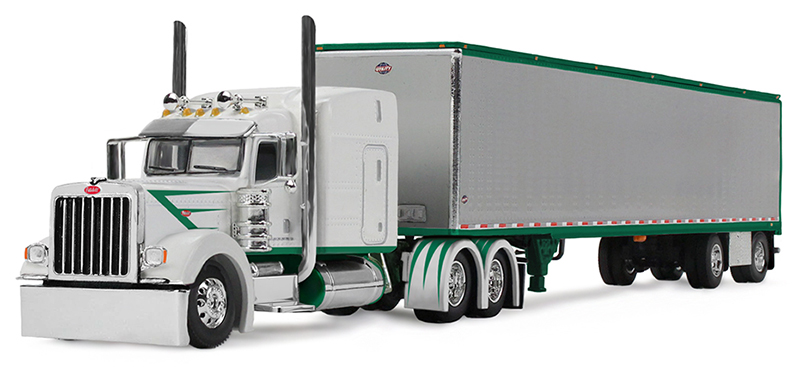 Peterbilt Model 389 with 63” Mid-Roof Sleeper in White with Green Stripes Hauling 53’ Utility Trailer